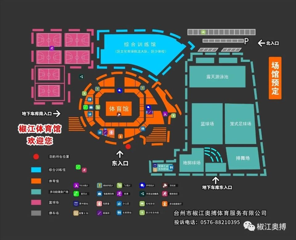 椒江体育馆有能容纳3000座位的室内体育馆,露天50M标准游泳池,四片露天篮球场,两片钢架结构风雨篮球场,24小时开放的能容纳200多个车位地下停车场及3000多平方的室外广场。